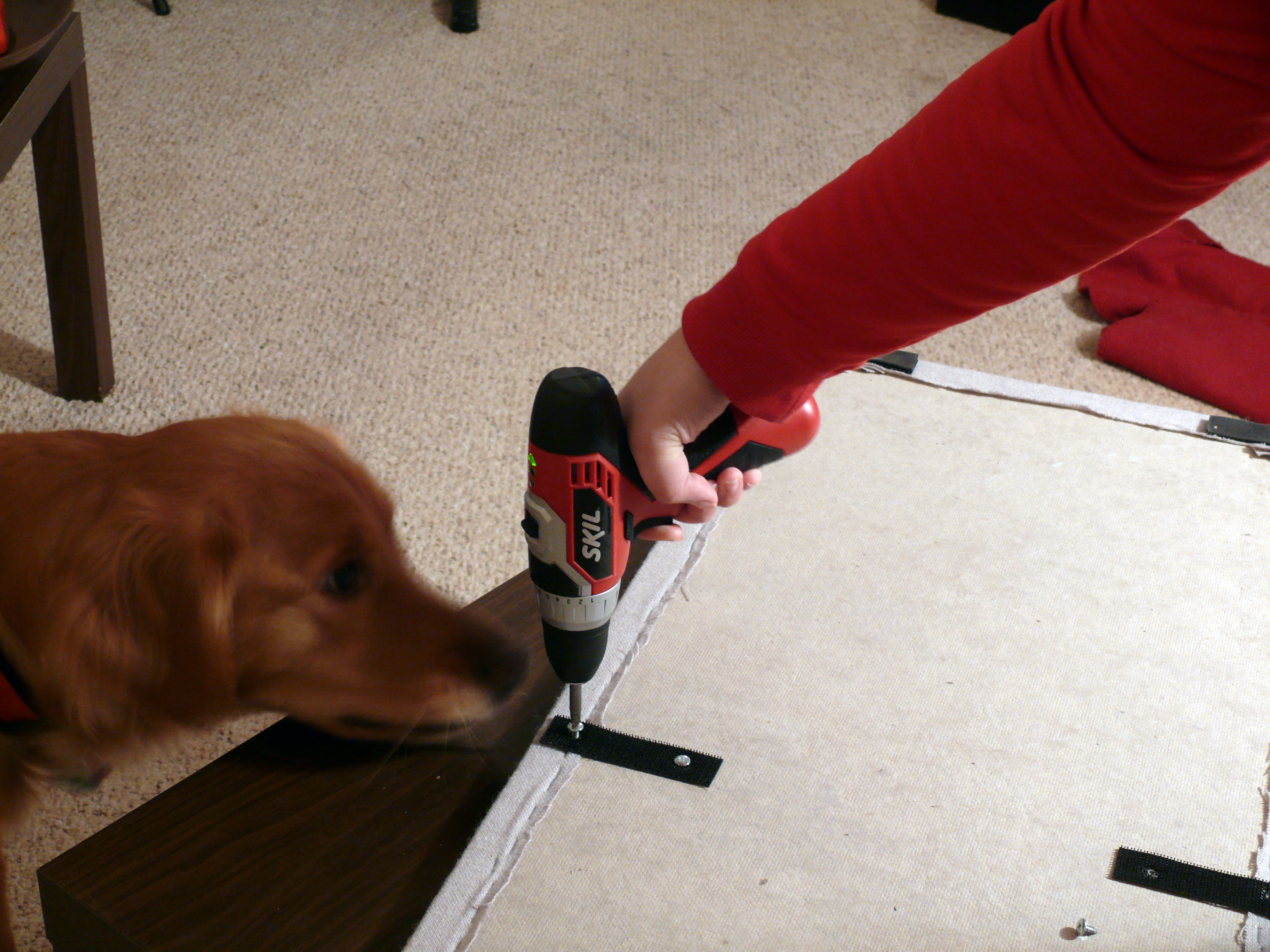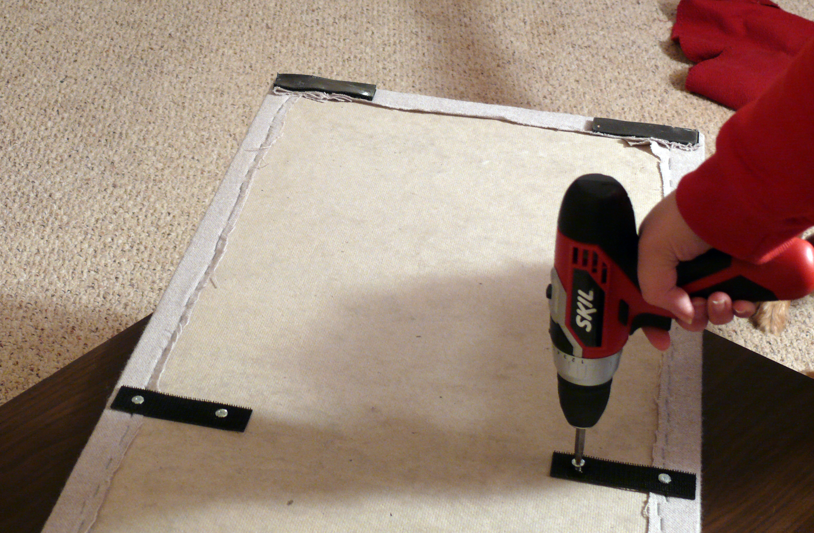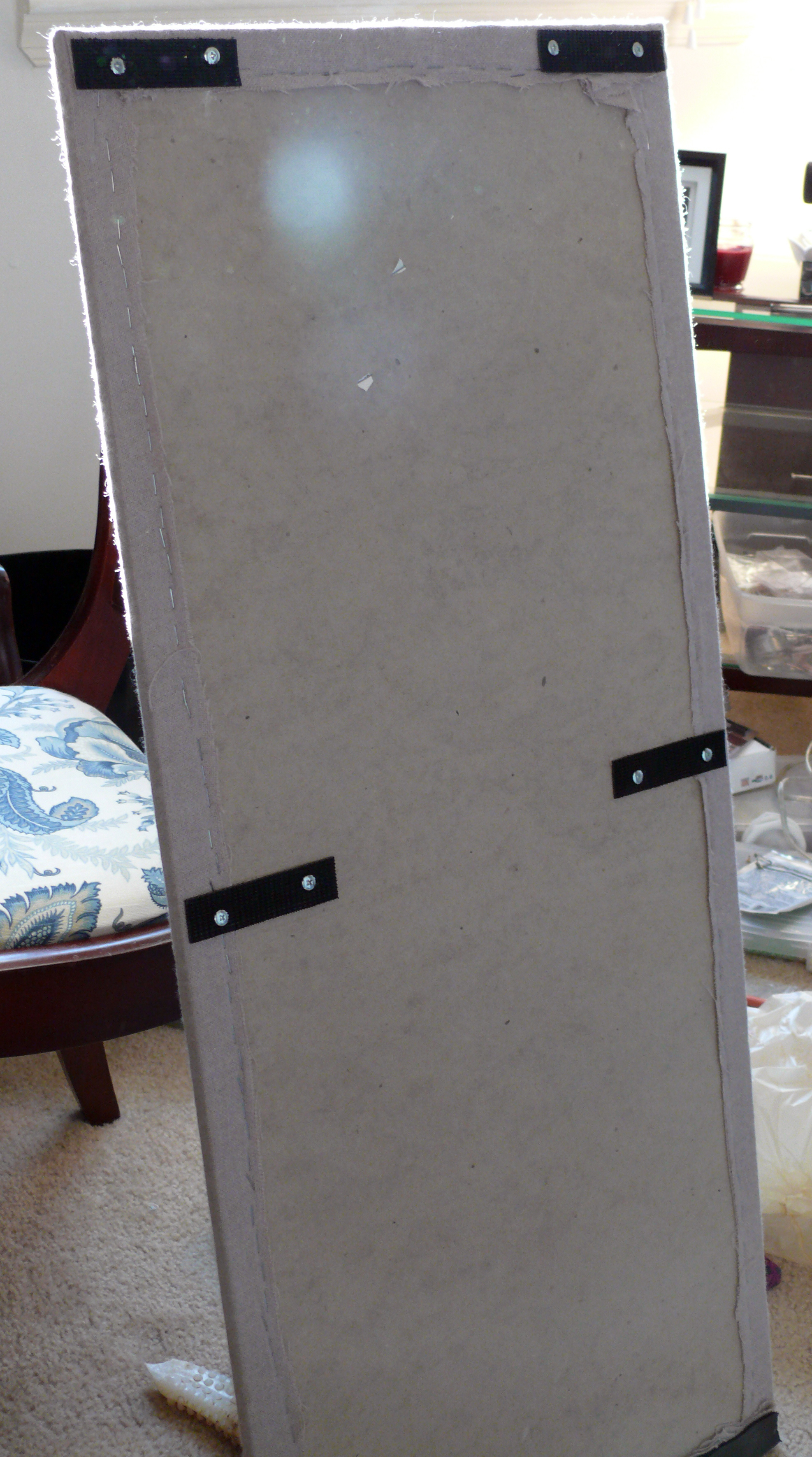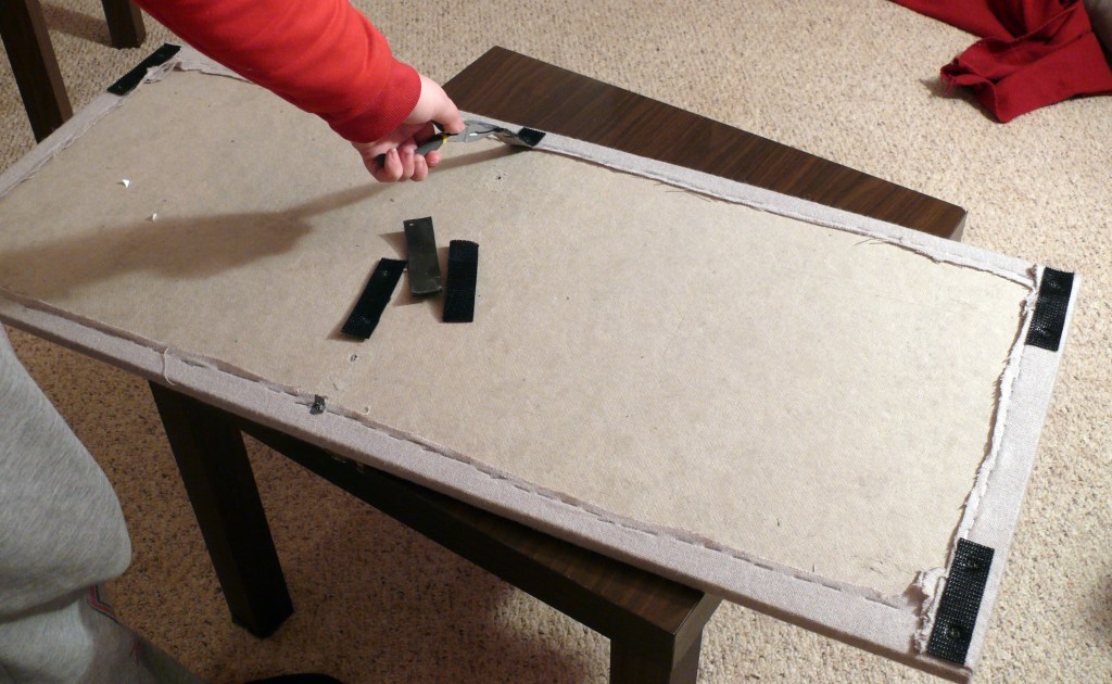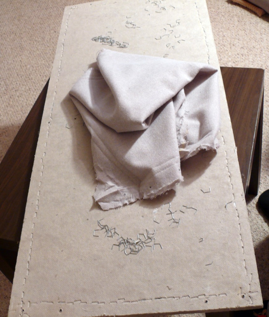 First, I had to take it apart. I removed the screws, pried off the old velcro, and then removed all of the staples and fabric.