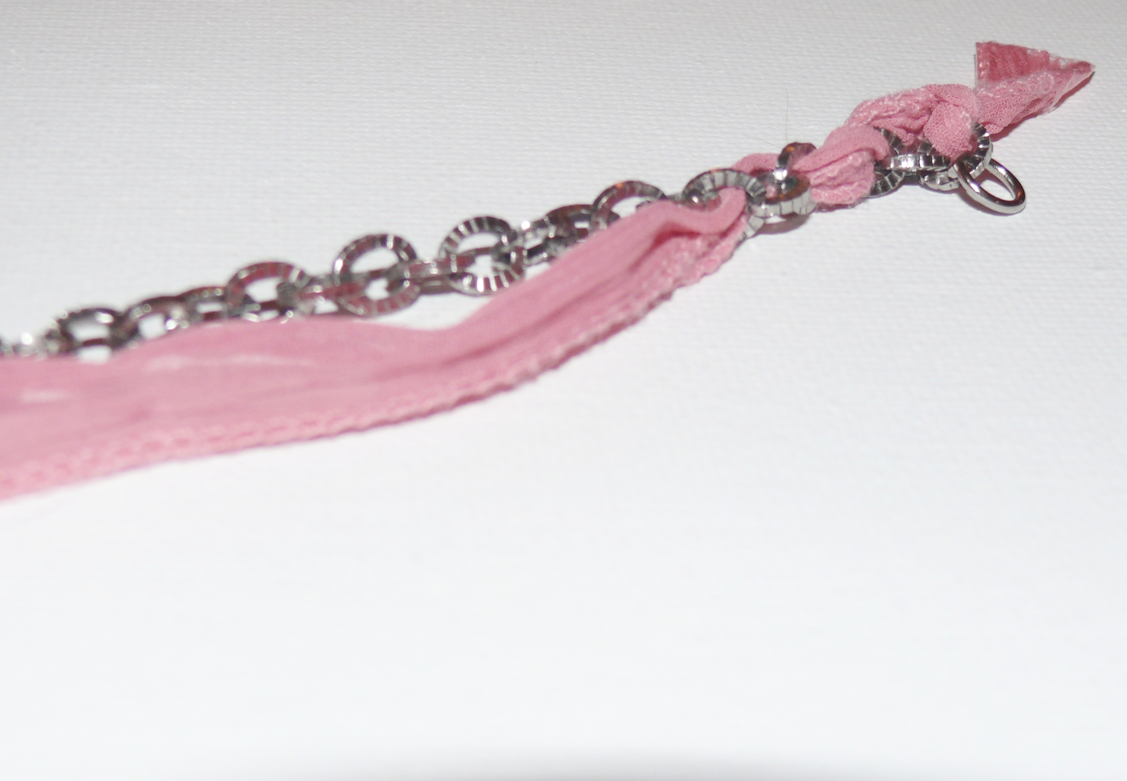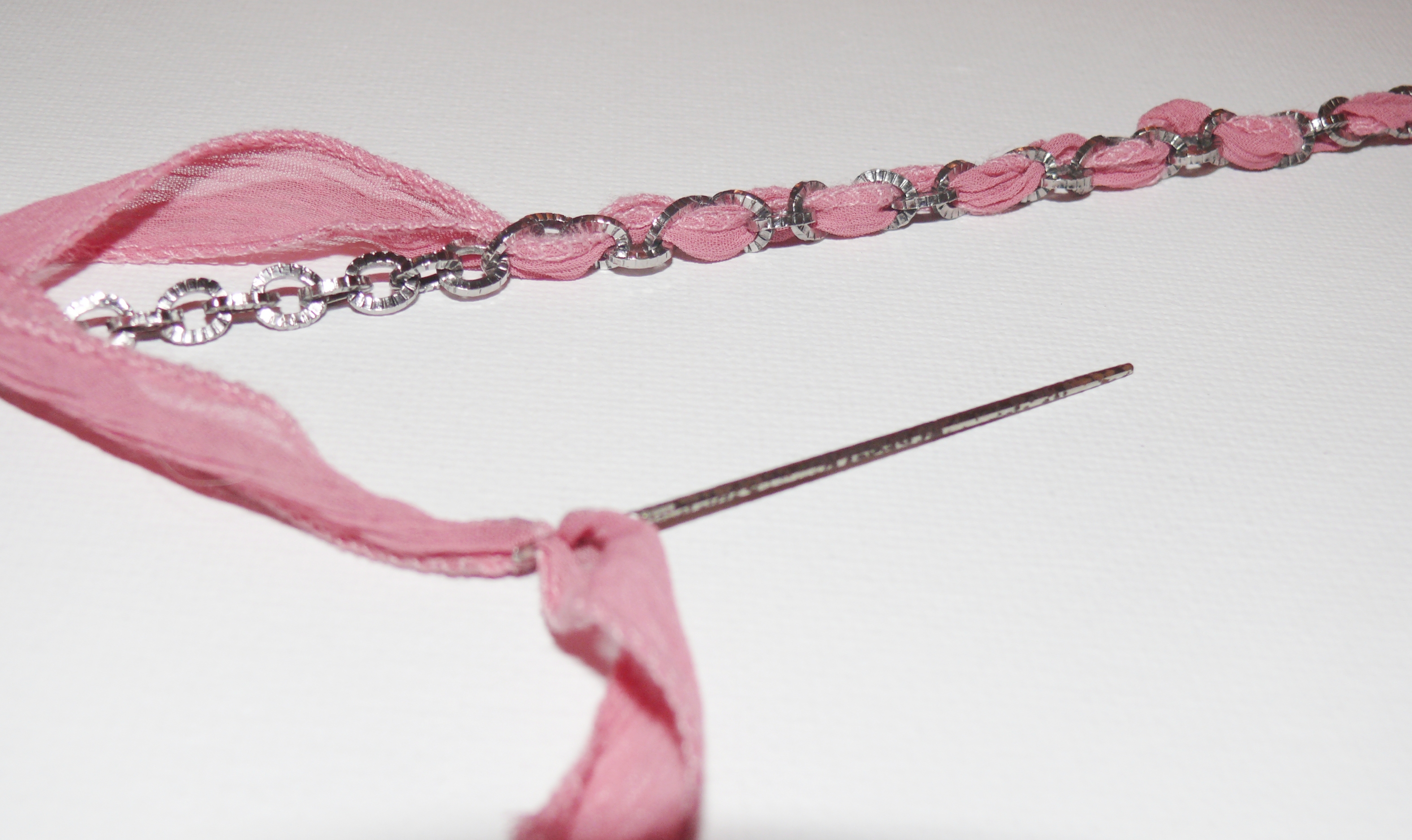I used ribbon in my necklace instead of fabric scraps, so I picked the chain with the smallest links. I figured I should save the larger links for fabric scraps later on down the road. I found a wide-eyed needle and threaded the ribbon through.