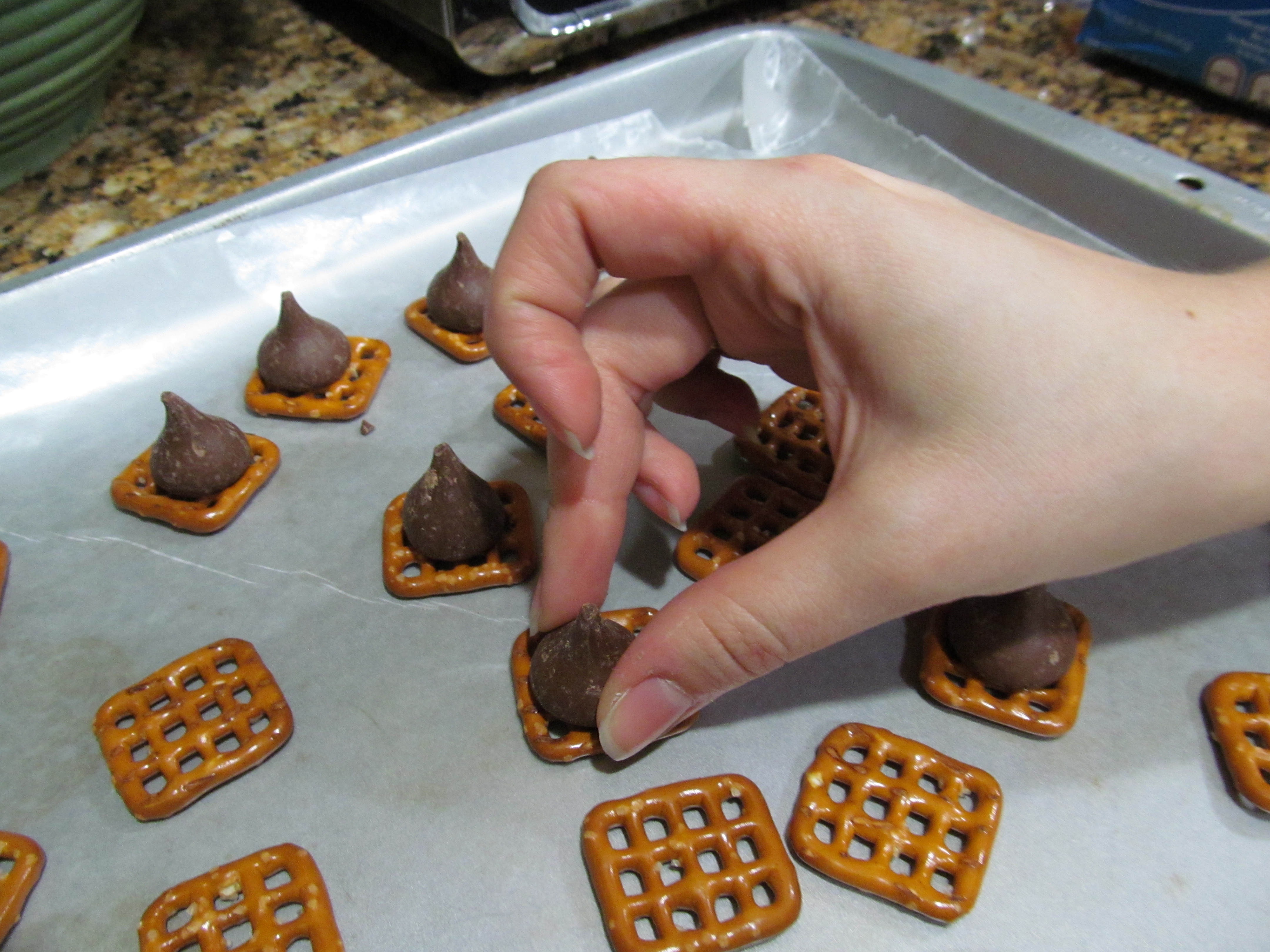 - Unwrap your kisses and place one on top of each pretzel.