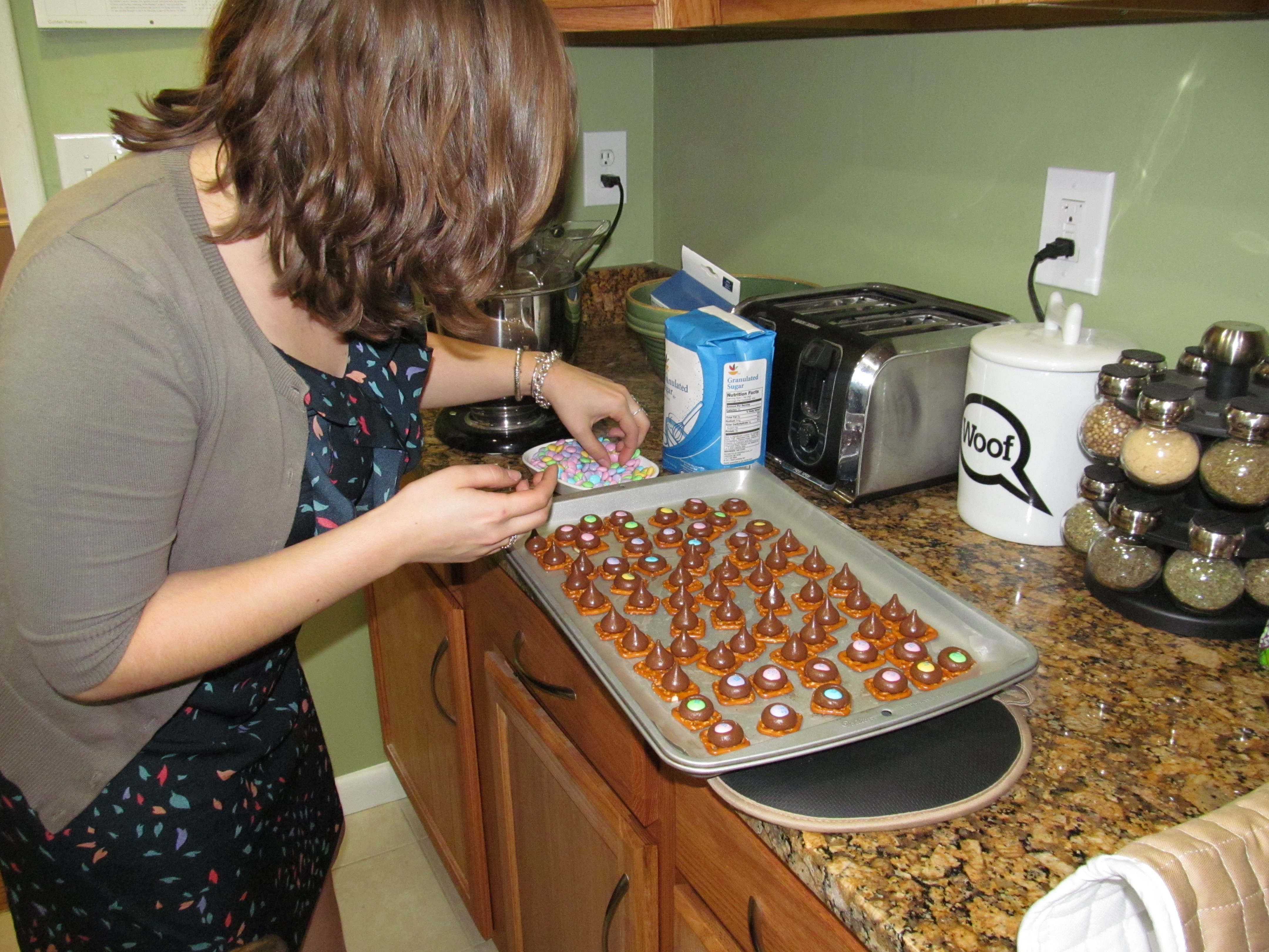 - Once your kisses look like they are shiny and glazed, take them out of the oven and start adding your m&ms.