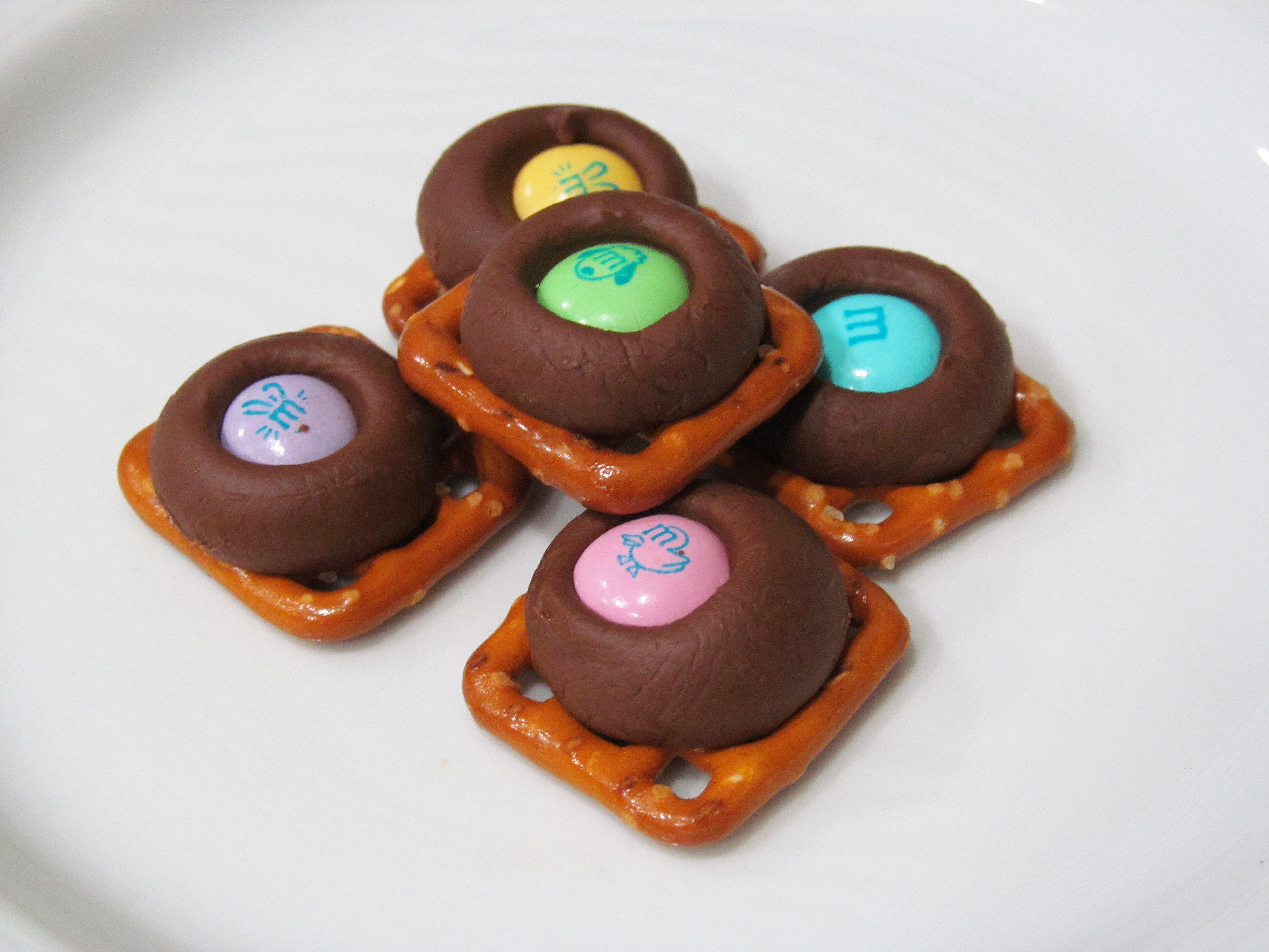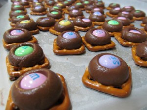 - Press down the m&ms so the melty kiss spreads over most of the pretzel.