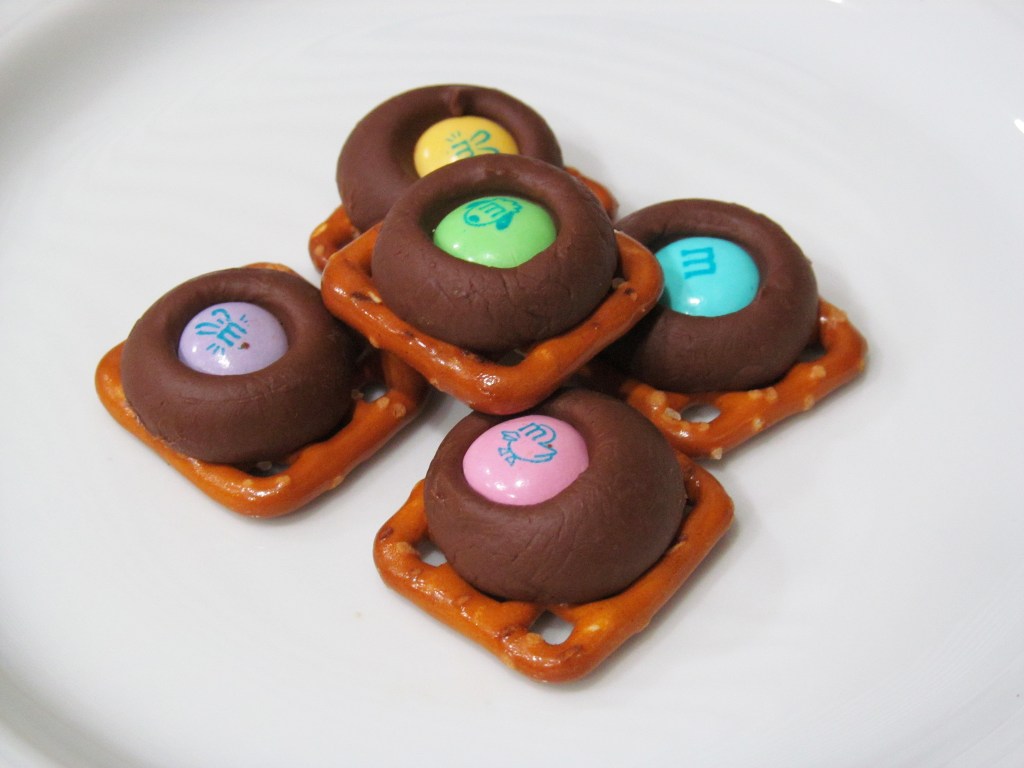 Our treats were a big hit at our Easter celebration and were the perfect blend of salty and sweet. Next time, I want to try using either a rolo or a caramel-filled kiss and maybe a different type of candy on top. All in all, this whole dessert took 15 minutes from start to finish and was so yummy! If you like chocolate covered pretzels, you should definitely try this out.