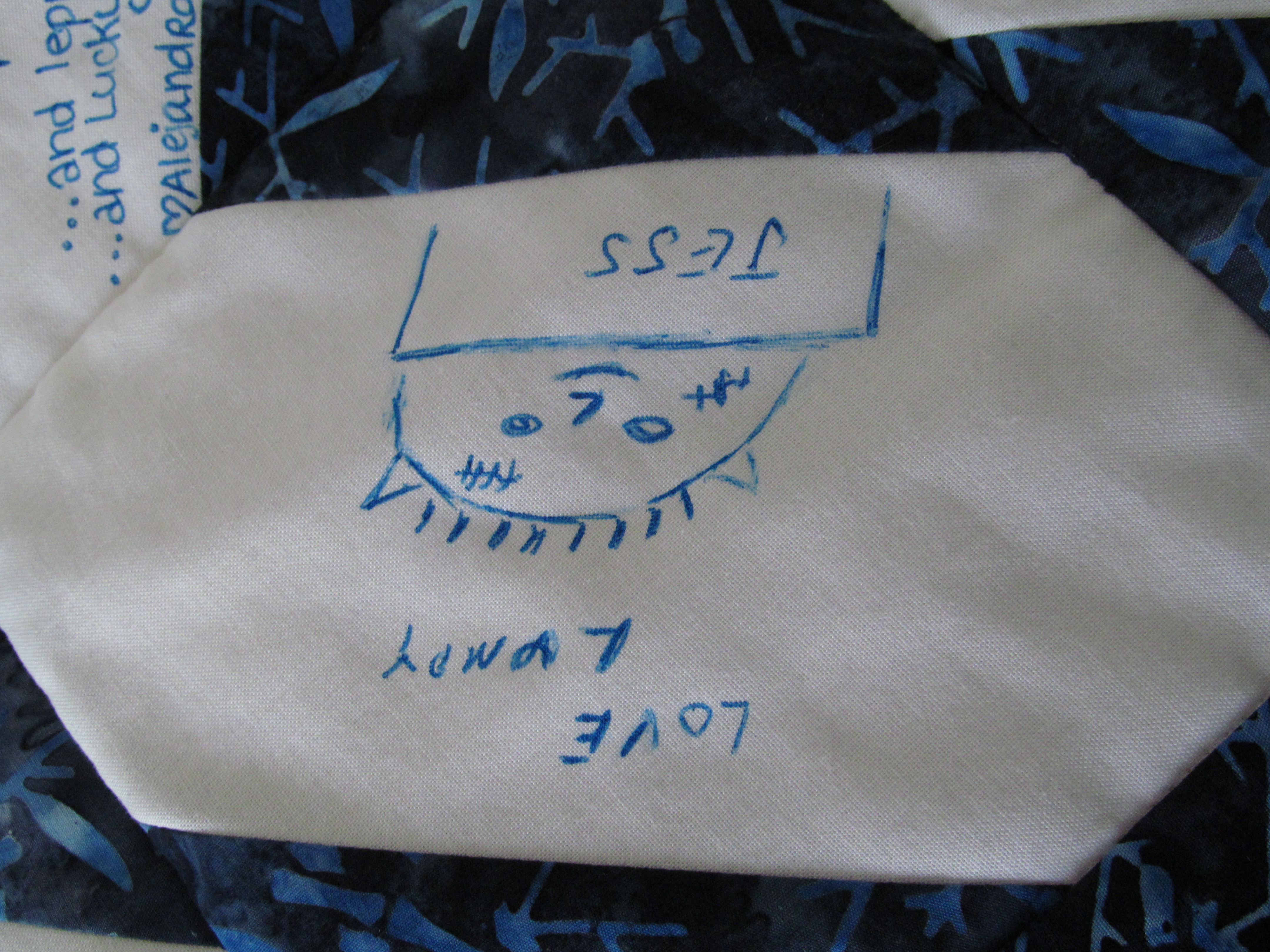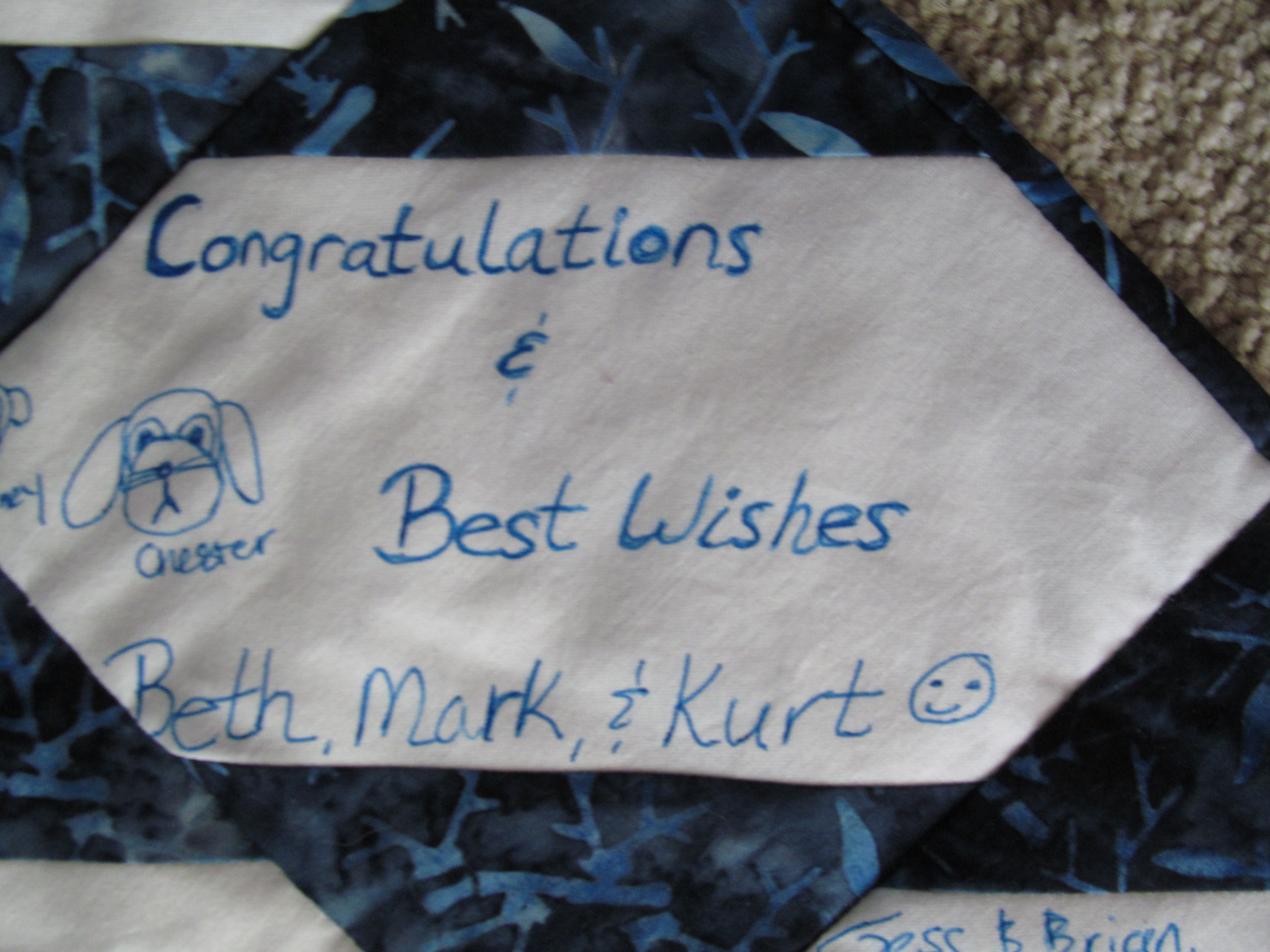 People at the wedding signed pieces of fabric using fabric markers — I don’t think my grandma treated the fabric first, although I could be wrong. The pieces were pre-cut so she could sew them into the quilt.