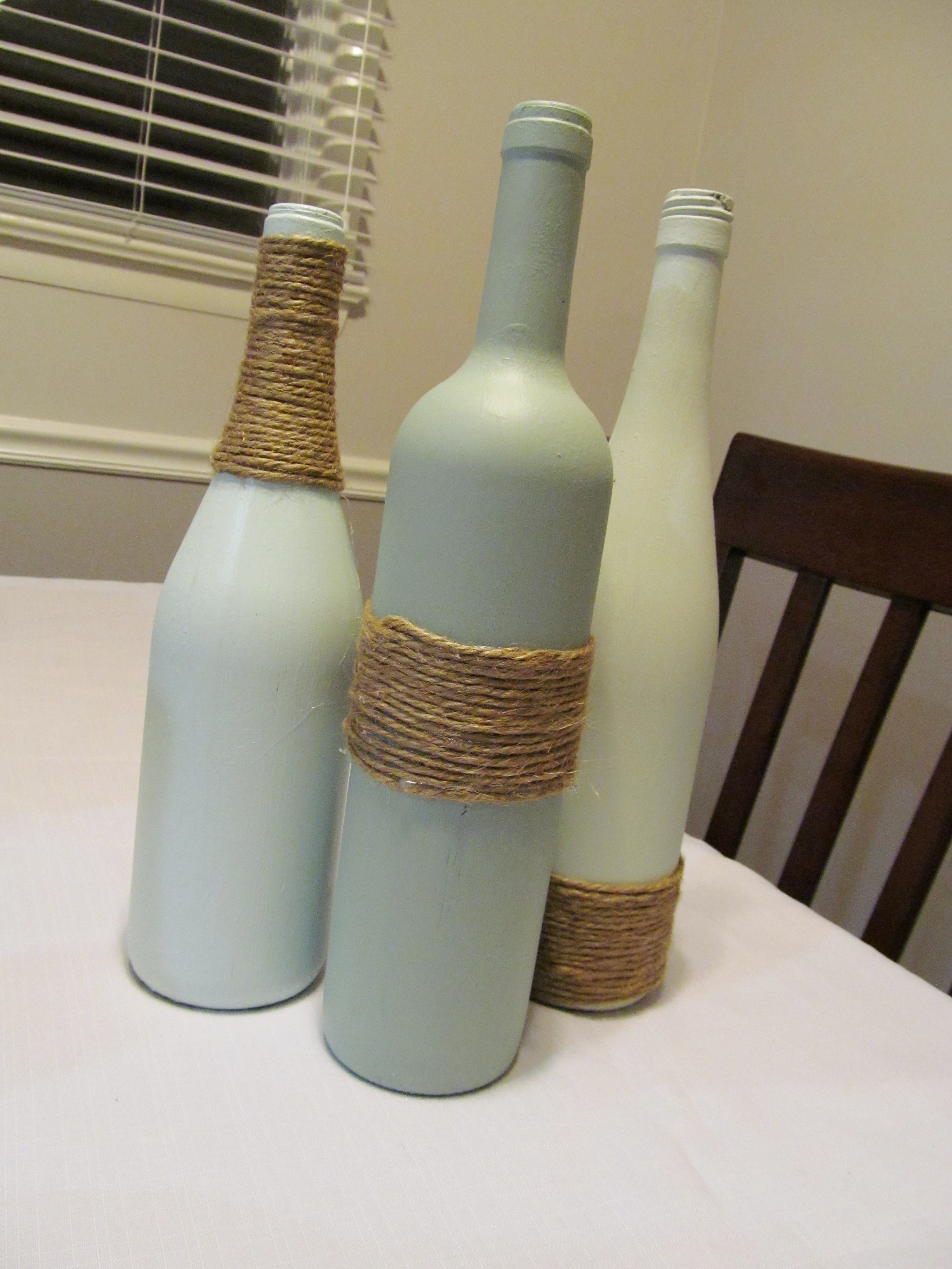 Carrie did a trio of bottles for her house. She painted the outside of the bottles with three different shades of paint. Then she hot glued twine at different heights on each bottle. Her trio looks amazing. I’m totally jealous!