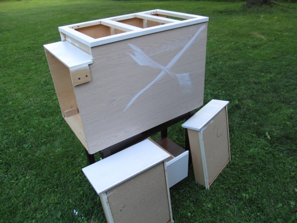 Before we picked up the third cabinet I planned on painting the other two white. I thought the white would pop against the teal walls. So I primed my yard sale cabinets, leaving “X” marks on the sides that I didn’t want people to see. Since my third cabinet was already white, I didn’t have to paint it!