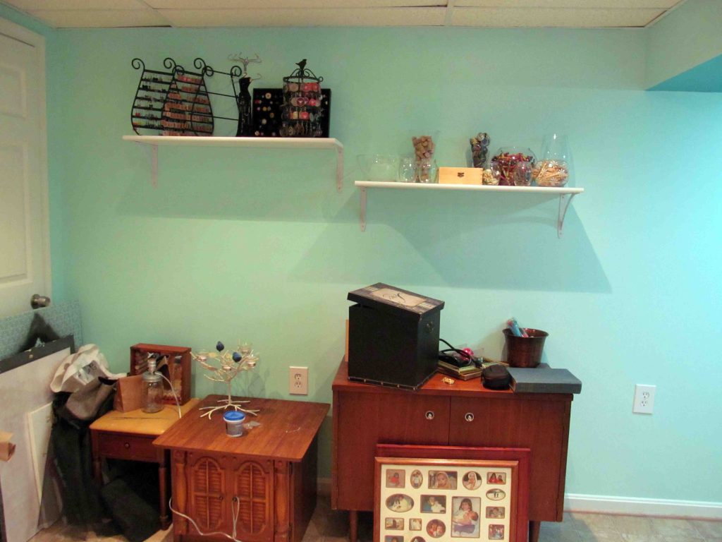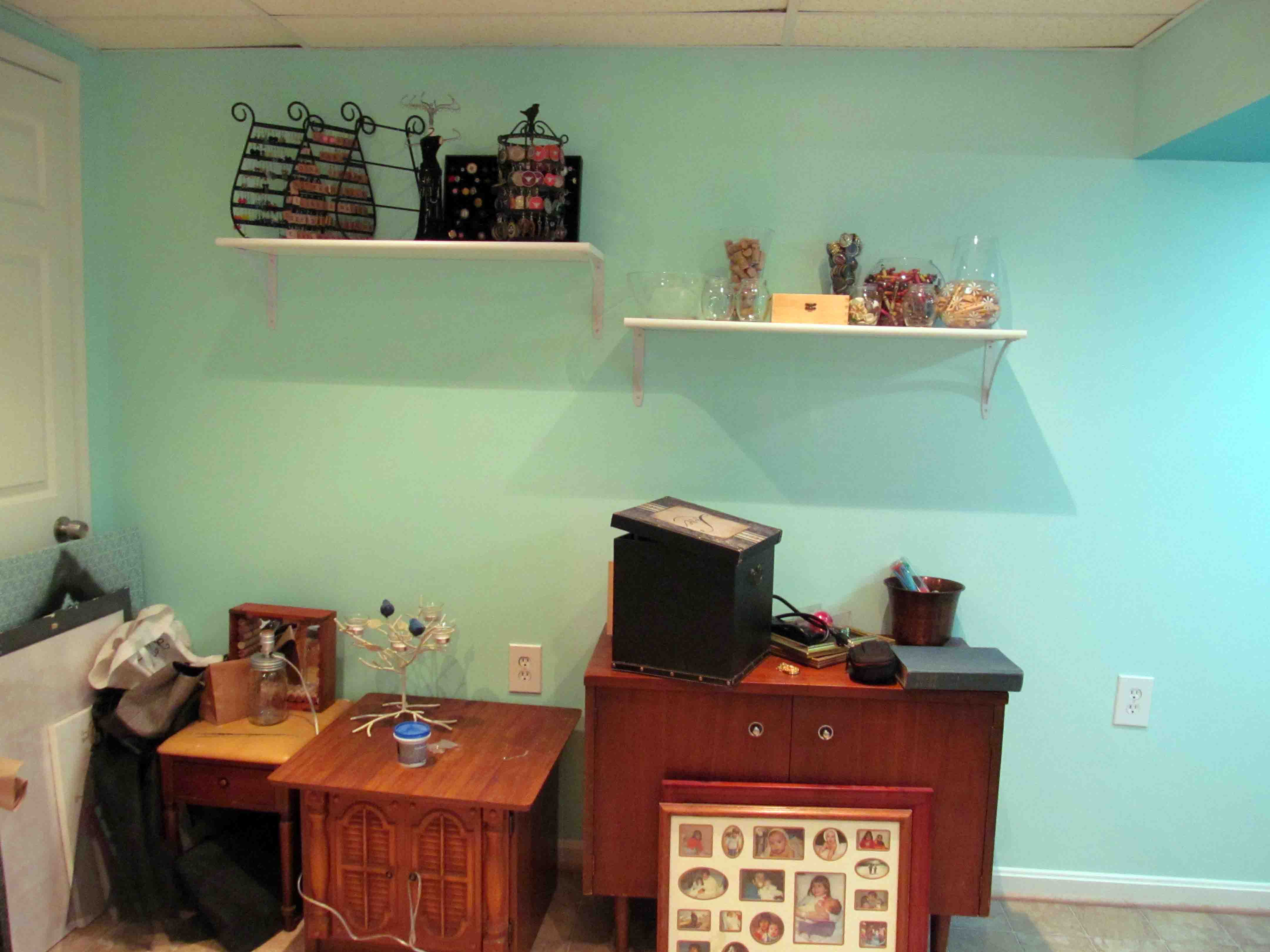 We also installed shelves for even more storage. The hubby and I bought super long shelves for our office right after we moved into our house. We had them cut down so they’d fit perfectly in our nook, and we saved the remnants just in case we needed them later on. These pieces were a great length for my craft room, so I grabbed some shelving mounts this weekend and I had me some fancy new shelves. (Don’t mind all of the crap below the shelves… I’m working on it haha).
