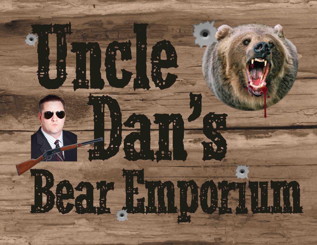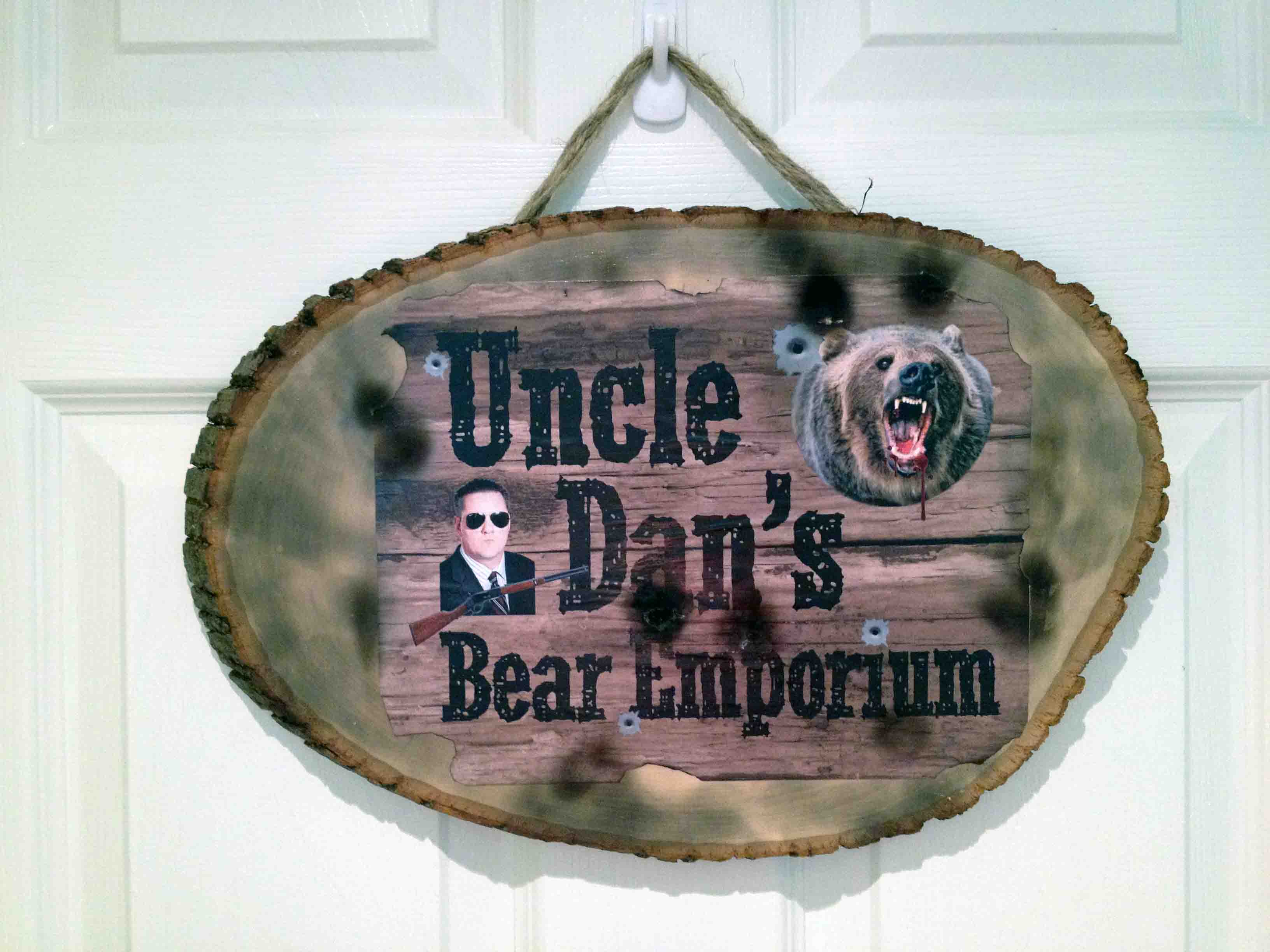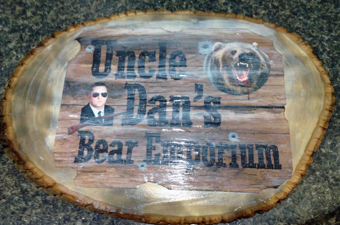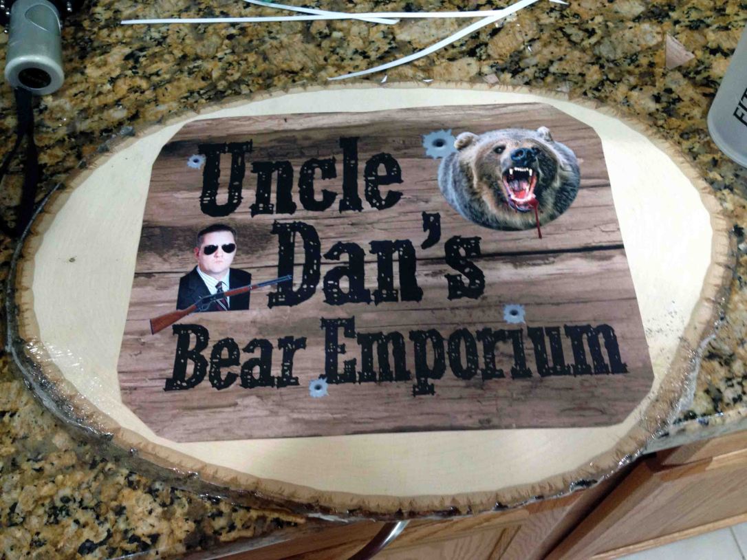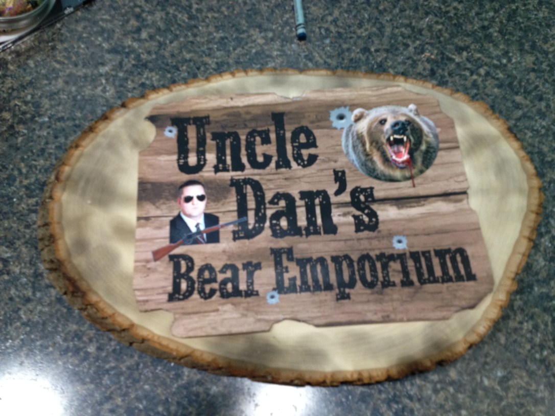 Yesterday was my coworker Dan’s last day in the office — he and his wife are moving to Greece for a couple of years. Dan has a fantastic sense of humor and is a midwestern boy. One of the long-running jokes in our office is that Dan wants to move to West Virginia to start a bear emporium… it’s better that you not ask haha. Anyway, he calls it “Uncle Dan’s Bear Emporium.” SOOOOO, the rest of the team devised a plan to make Dan a sign for his fictional business for him to take overseas with him. While I doubt anyone will want to replicate this project exactly (who else wants a fictional bear emporium after all?), I’m sharing it because 1. it’s awesome, and 2. it turned out to be a pretty authentic looking wooden sign.