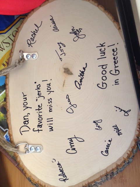 We all signed the back before sending our coworker off to Greece in style. I wonder what they’ll think of the sign in customs?