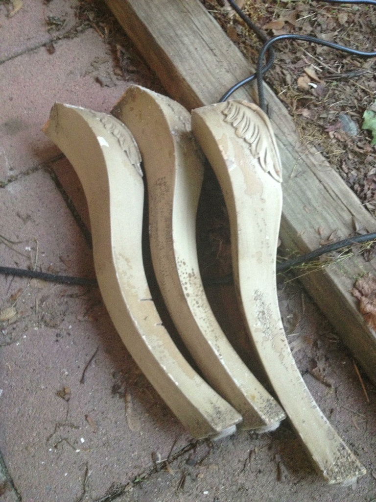 Cut the legs off on one and am now trying to figure out how to put new, inexpensive legs on. Ha! Oops. I’d love to do hairpin legs, but they are too pricey for this project. The curved table might be too fancy, too. Oh well! I’ll figure it out.