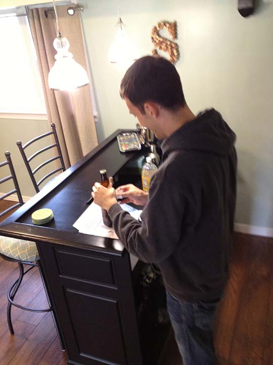 Drill through the cork — don’t go top to bottom, rather drill through the side of the cork, somewhat near the top. This will be the heigh of your antlers.