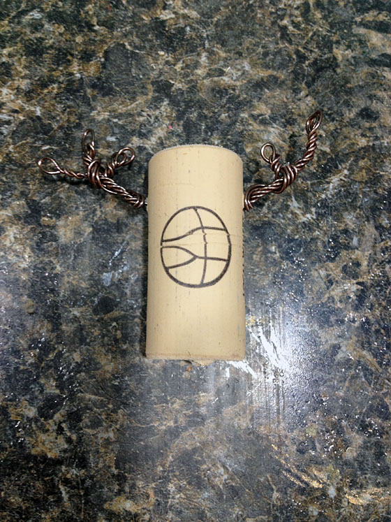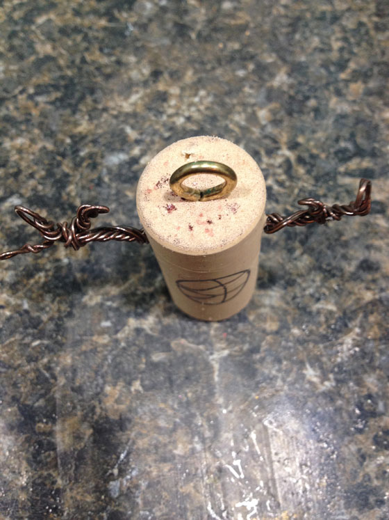 Cut a long piece of malleable brown wire and fold it in half. Stick the wire through your drilled hole, sending the folded end through the cork first. I learned the hard way that it is much more difficult to get your wire through your cork if the sharp end leads the way.