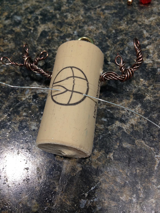Here’s where your cork having “skin” is important. I took a nail and pressed it through the skin of the cork as an appropriate eye level for rudolph. It went in at one point and came out another — these entry/exit points are where the wire will enter and exit.