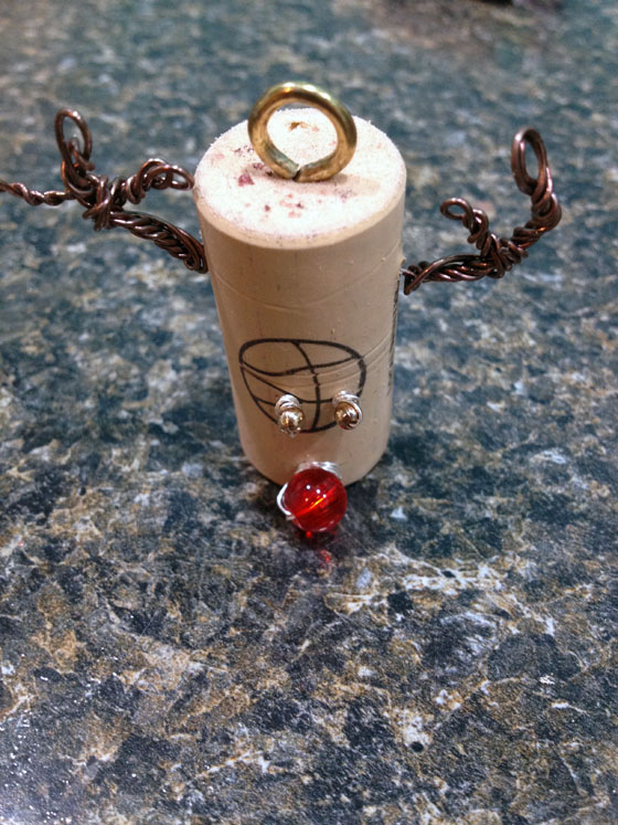 I used this exact same process for the nose. I tried to make the entry and exit points closer together when feeding the nail through the cork since the nose didn’t need no be spaced far apart like the eyes. I used beads and bells on different ornaments, but each one needs to be secured to the cork by wrapping the wire around the base.