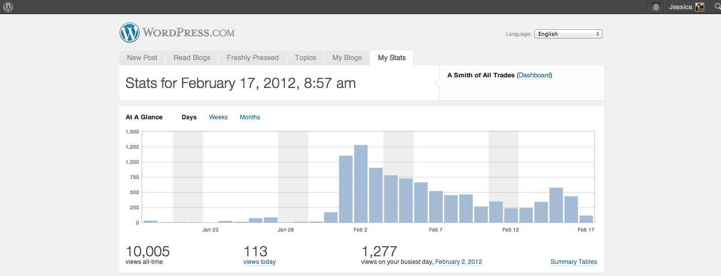 I started on this venture a year ago today after many months of trying hard to decide on a name. My coworkers had suggestions and we even had a white board in our kitchen with a running list of ideas. When I finally came up with a name I liked (I couldn’t sleep one night and A Smith of All Trades popped into my head), I started blogging pretty much immediately and haven’t slowed down since.