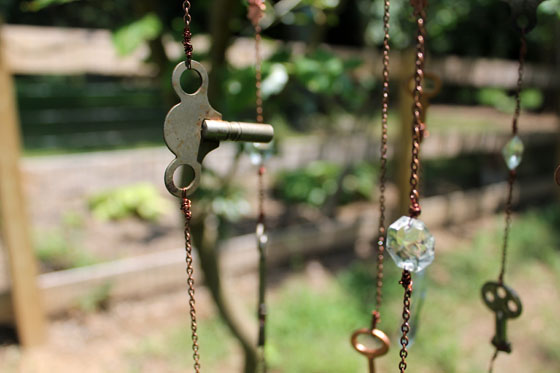 Remember how I altered my aunt’s beautiful wind chime to match her preexisting one? That project inspired me to think out of the box to create her a final wind chime to complete her set. Both of her chimes are copper with key and crystal accents, and I happened to have a ton of old keys and chandelier crystals in my craft room. What luck!