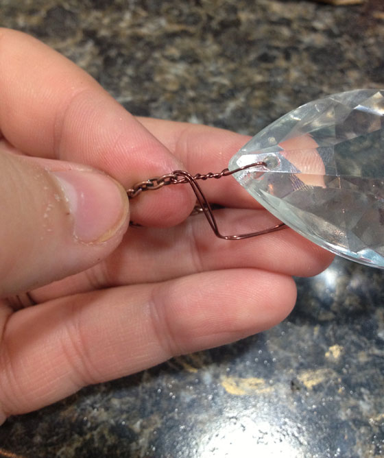 To get the crystals onto the chain, I took a copper wire and looped it through the pre-drilled hole.