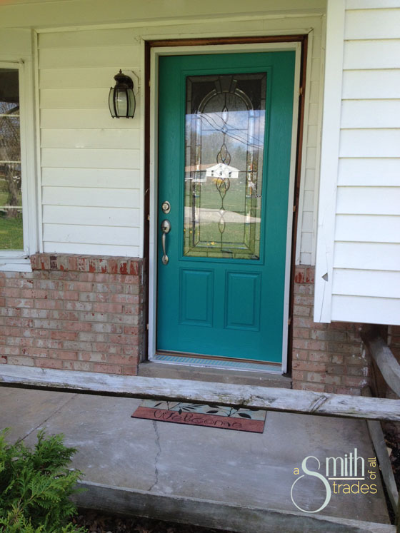 So I reached out to you all on Facebook for color suggestions, and my cousin-in-law responded suggesting teal! About the same time she responded I Was flipping through Lowe’s doors photo gallery where I stumbled upon a teal door on a white house and totally fell in love.