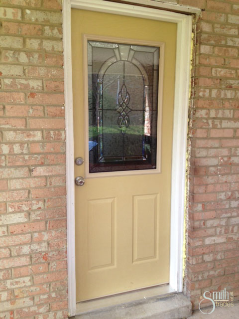 Everything we went through on the car port door, we went through on the front door — and them some. We had to completely remove the brick molding on this door to get it into the opening, which was way too wide for our door. *sigh*