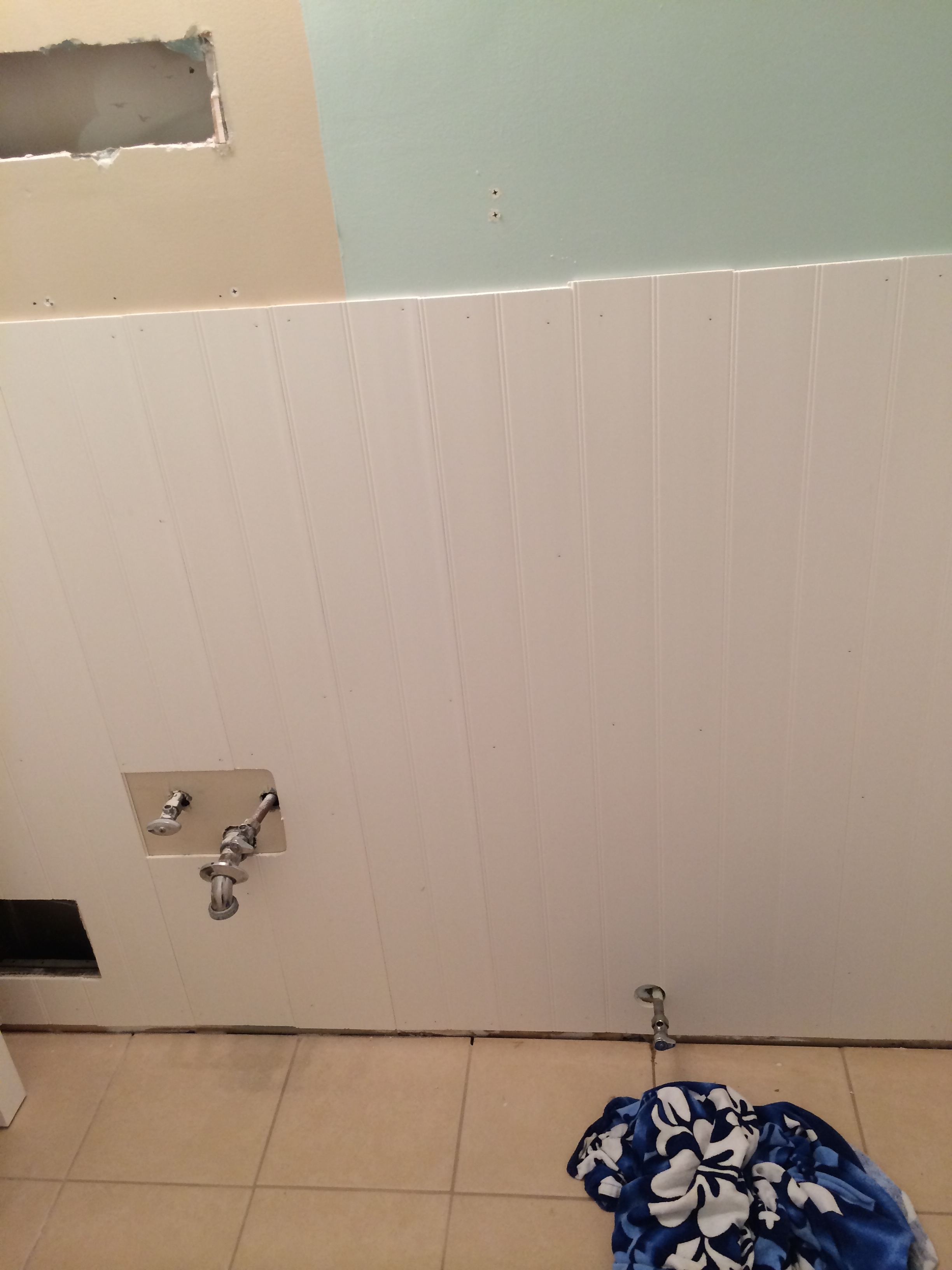 We cut around the pipes behind the vanity, then used a hole saw for the pipe behind the toilet. It worked great. To install the bead board, I used adhesive and my nail gun.