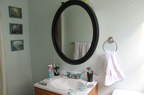We’d already replaced the mirror with a surface-mount medicine cabinet, but I quickly grew tired of having the mirror sticking out in my business when I tried to brush my teeth and do my hair.