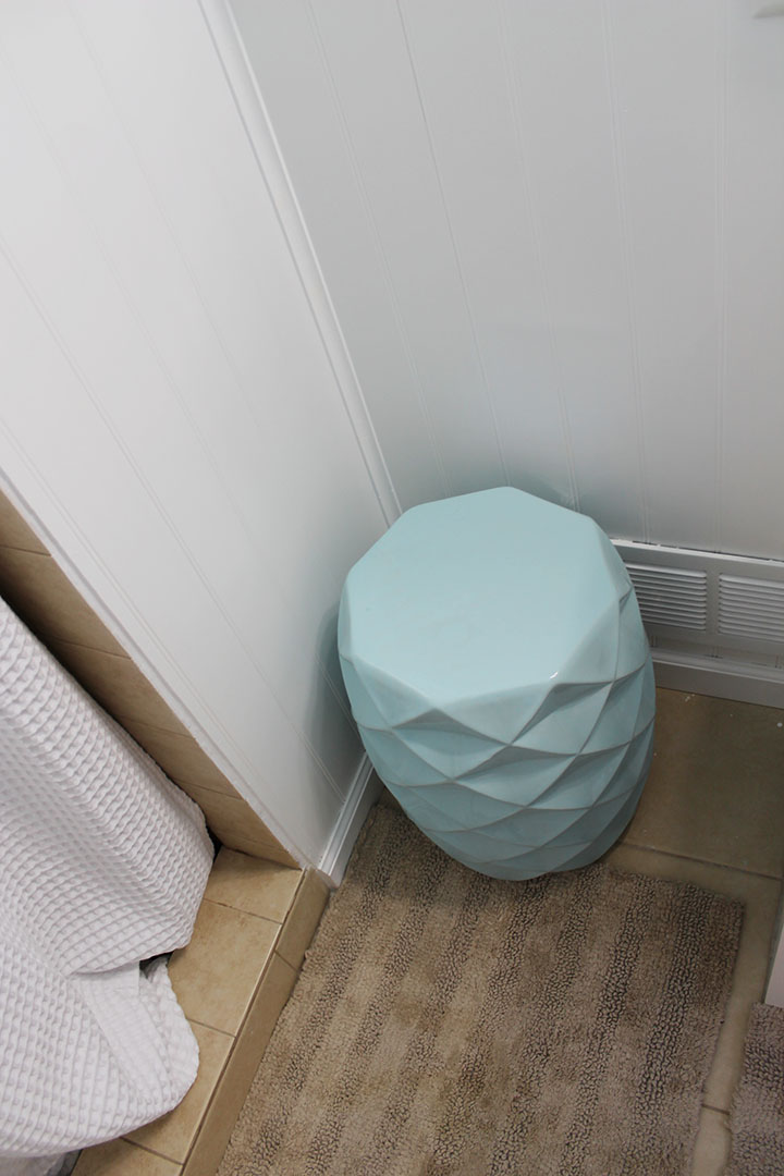 The design looks on point, for sure. I think the all while bottom, including the sink and vanity, looks really crisp. I chose beige bath mats to blend in with the floors versus having a color pop out on the floor. My only color rebellion is my new garden stool that I rest my hairdryer and brush on when I get ready.