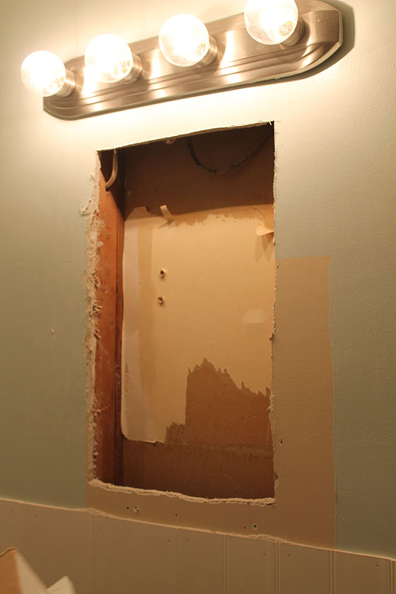 I shared the hole in the wall photo already. After we installed the bead board, but before we added the chair rail molding, Allie and I cut out the hole for the medicine cabinet. This was one of my favorite parts.