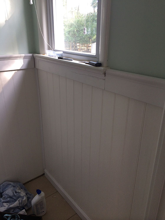 Up next, paint! The bead board and trim got three coats of white paint.