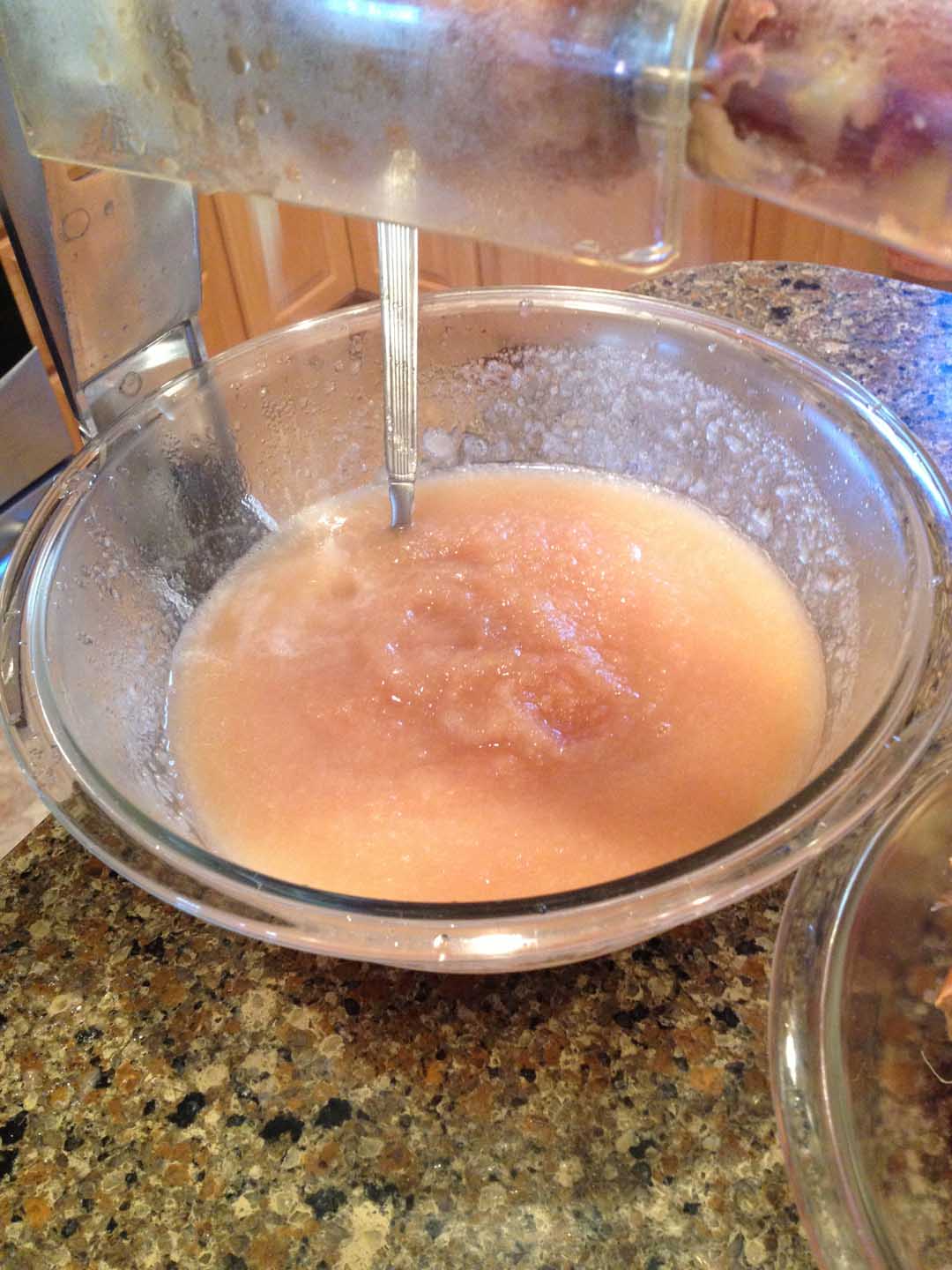 Once we had enough apples steamed to start making sauce, we put pots and pots full of them through the grinder. A few tips: Be gentle when mashing the apples down into the processor because stuff will go flying. Also, send the peels through a couple of extra times before tossing them. You can get a little bit more applesauce out of them!