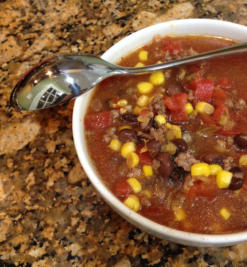 The best part about this soup is it is easily customizable without totally altering the taste. If you want more meat, add more. If you want less broth, add less. If you love green peppers but hate corn, the recipe will still turn out. I made it last night with three cans of petite tomatoes (total rebel, right?) and no green pepper (I forgot to buy them… oops!), and it was still delicious.