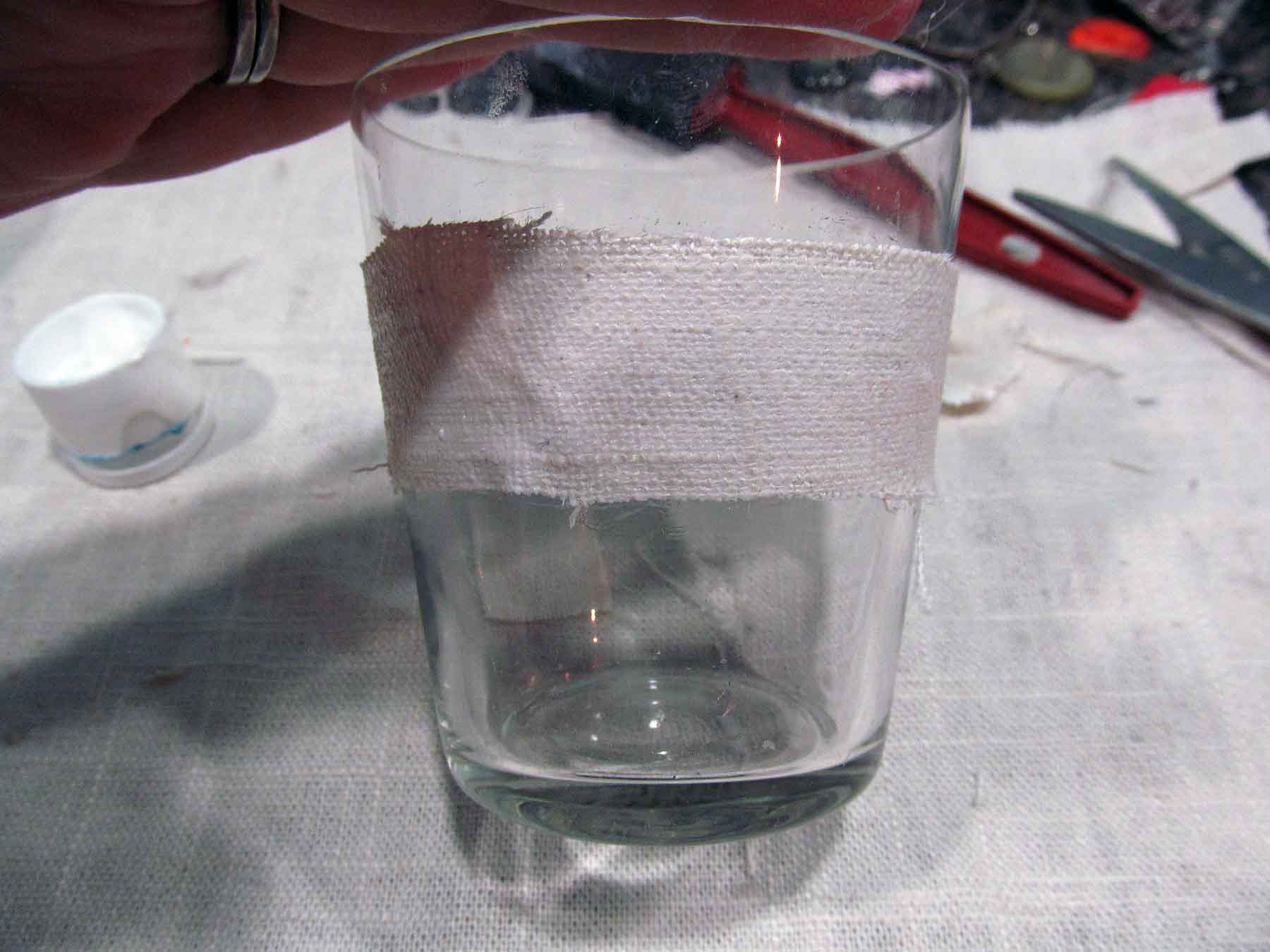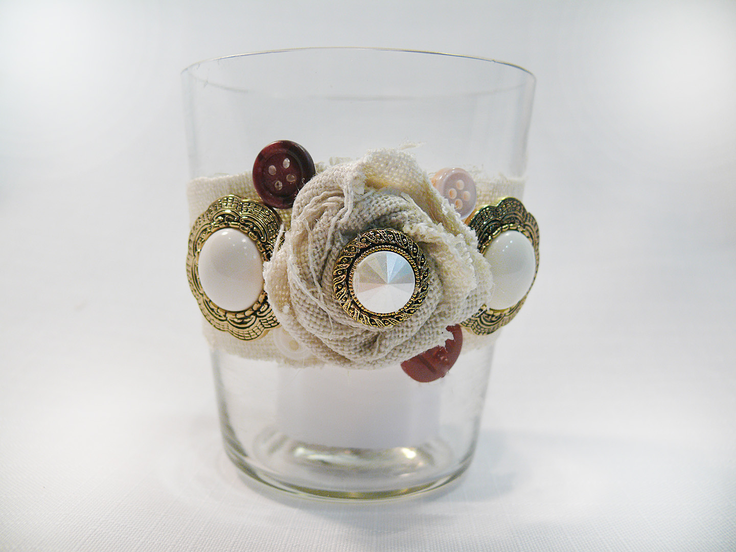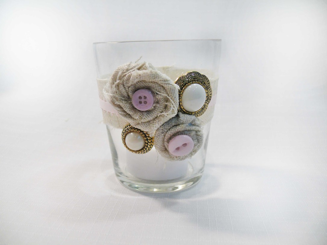For my first project, I made a set of candles using fabric scraps or burlap that were barely big enough for the task at hand. I also used old buttons and thrift store glasses. The only “new” supply I used was some pink ribbon.