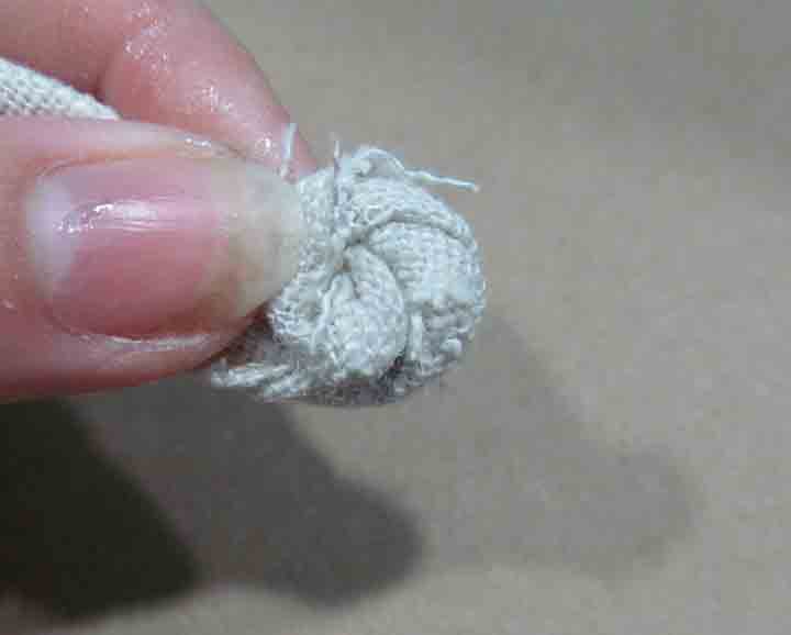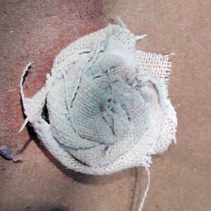 To make the rosette, I twisted on end of the fabric in my fingers and added some Mod Podge. This is the center of the rosette.