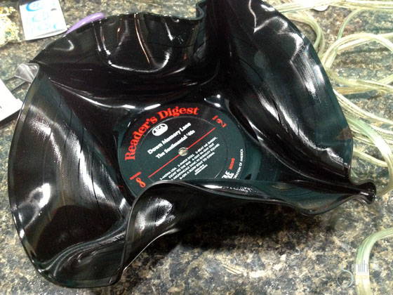 Another spring break project — a record bowl pendant light. I made record bowls last year and again last fall to sell at my trash to treasure craft fair. They are fun and easy to make, and they can be turned into awesome things even after you’re done! For example, a pendant light.