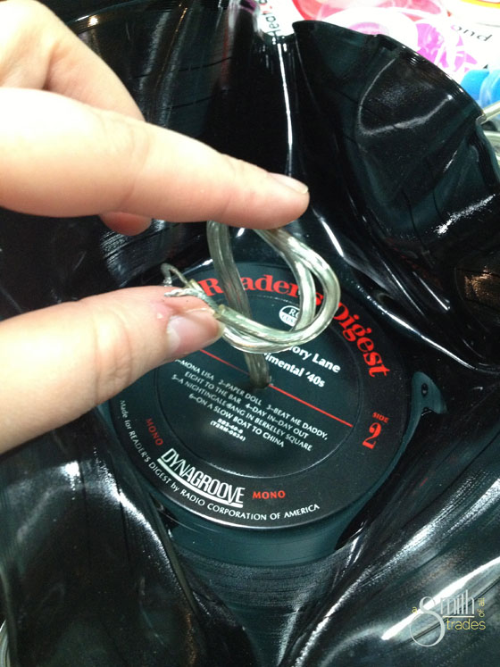 With the wires free, I was able to feed them through the hole in the center of the record.